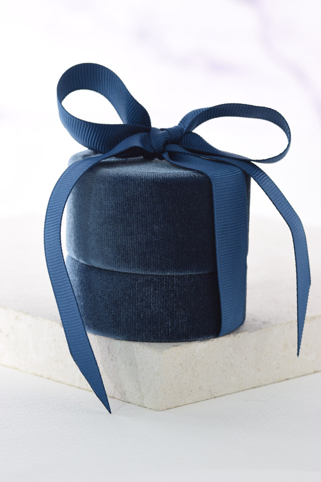 Tamaño del estuche de terciopelo azul: 5.5 cms de diámetro y 5 cms de alto.