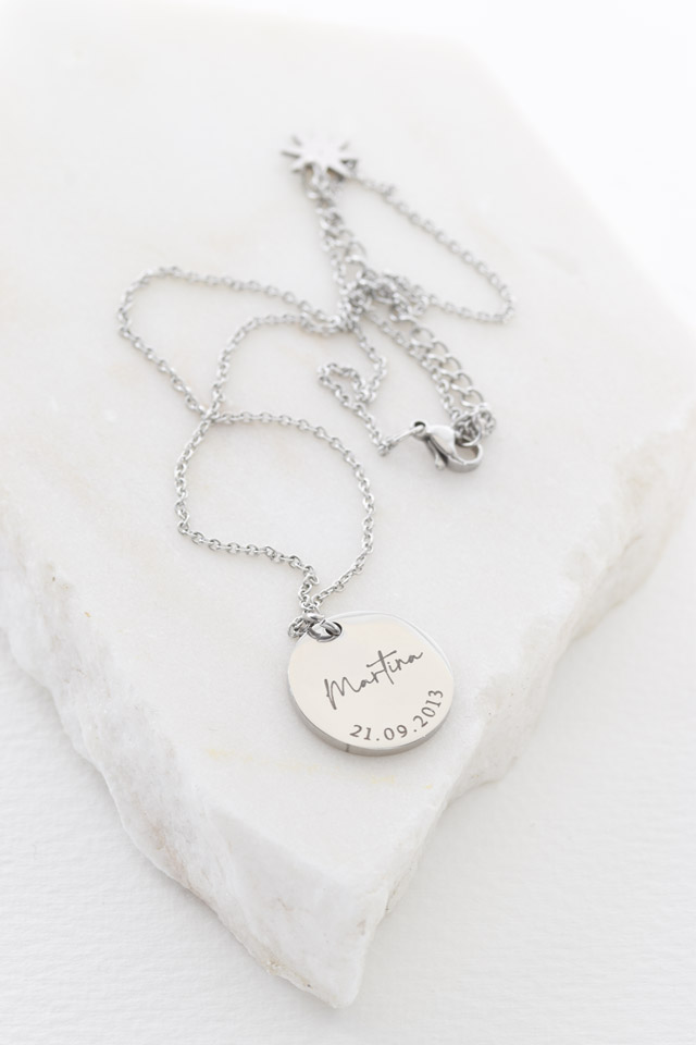 Este colgante circular es el lienzo perfecto para grabar nombres y fechas que cuentan tu historia, convirtiéndose en un amuleto que celebra nacimientos, aniversarios o vínculos inseparables.